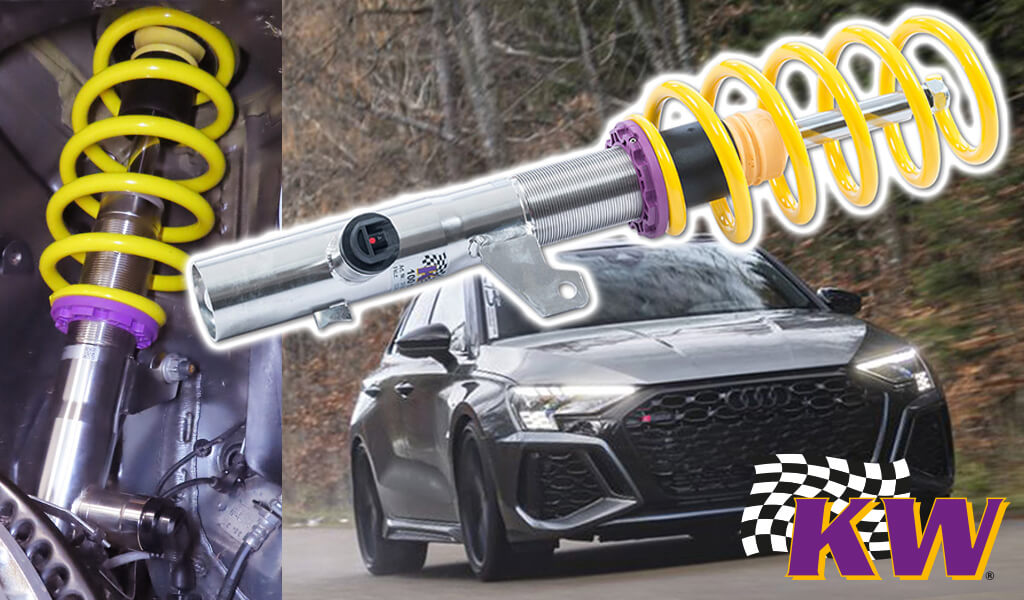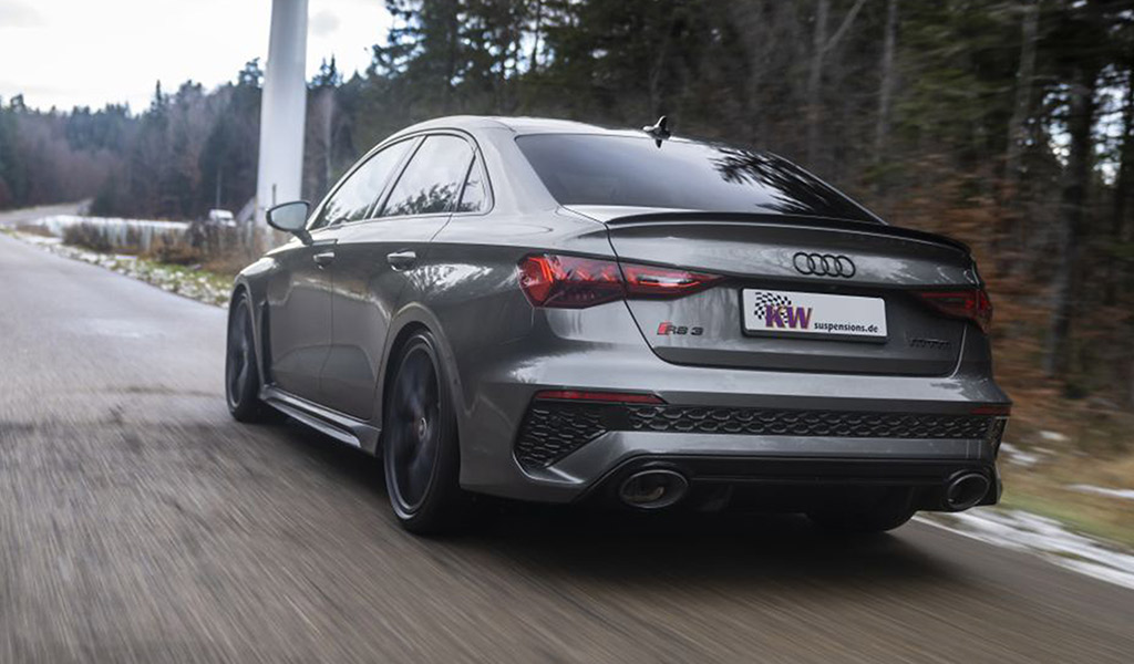 Für RS3 Modelle ohne optionales DCC Seriensportfahrwerk empfiehlt sich die Nachrüstung des manuell in der Druck- und Zugstufe unabhängig einstellbaren KW V3 Gewindefahrwerks (ab CHF 2475.–) oder in der Höhe einstellbarer KW Gewindefedern (ab CHF 655.–).