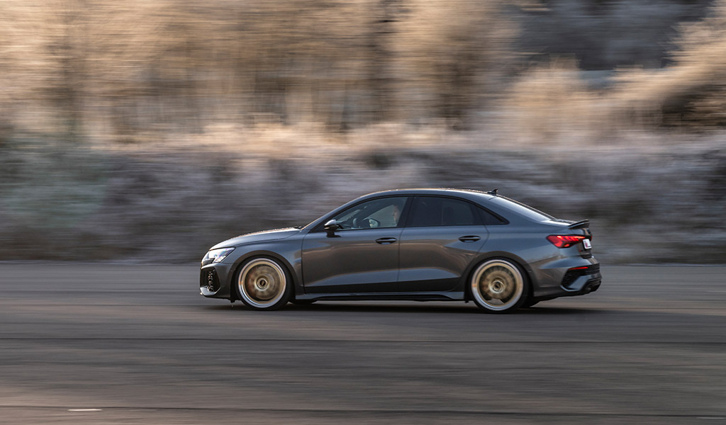 Der 400 PS starke RS3 mit seinem kernigen Sound bleibt selbst bei sportlicher Fahrweise durch das Gewindefahrwerk noch besser beherrschbar. Die typischen Nick- und Wankbewegungen des Karosserieaufbaus sind deutlich reduziert.