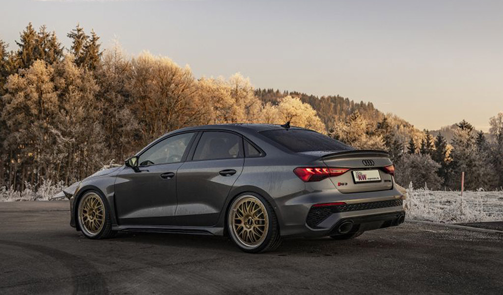 Der Einbau des KW DDC plug & play (ab CHF 2890.–) gestattet eine stufenlose Tieferlegung von bis zu 40/45 mm im neuen RS3 (Limousine und Sportback). Für RS3 Modelle ohne optionales DCC Seriensportfahrwerk empfiehlt sich die Nachrüstung des manuell in der Druck- und Zugstufe unabhängig einstellbaren KW V3 Gewindefahrwerks (ab CHF 2475.–) oder in der Höhe einstellbarer KW Gewindefedern (ab CHF 655.–).