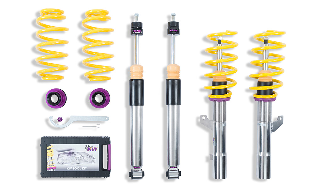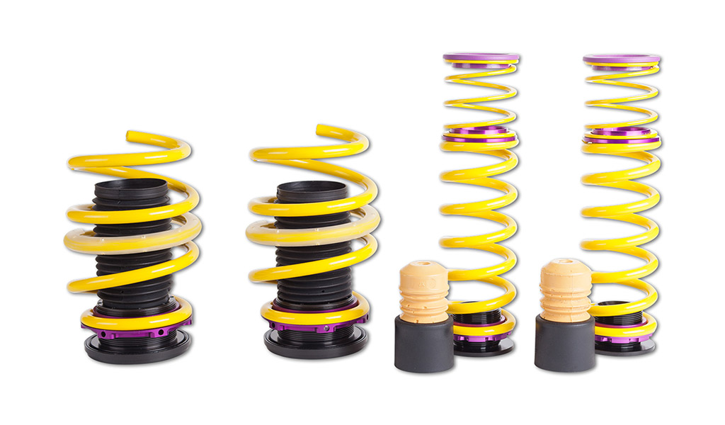 Steht keine maximale Tieferlegung in Verbindung mit einer Fokussierung auf mehr Fahrdynamik, sind auch in der Höhe einstellbare KW Gewindefedern erhältlich, die in Verbindung mit dem Serienfahrwerk eine stufenlose Tieferlegung von 0 bis 20 mm ermöglichen.