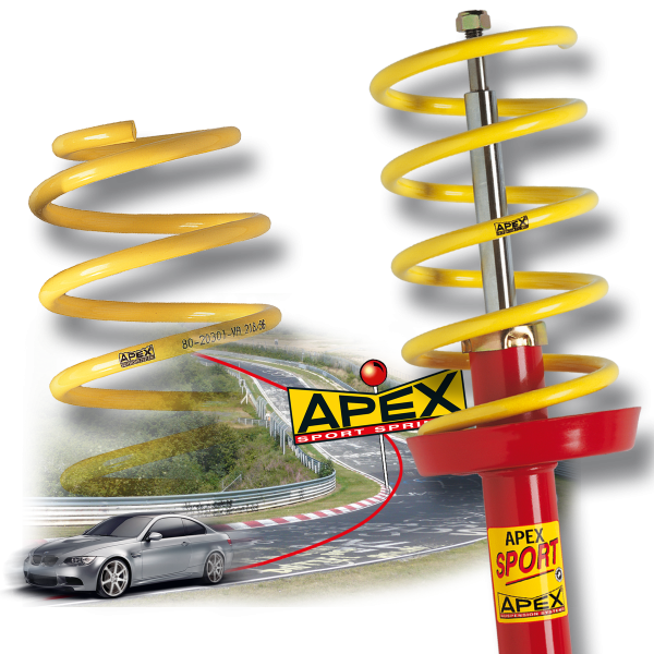 APEX Sport Tieferlegungssätze kombiniert mit APEX Gasdruck-Sportstossdämpfern. Für ein spürbar besseres Fahrverhalten, straff-sportlich, und eine sportlich tiefe Optik und optimale Performance ohne Restkomfortverzicht.