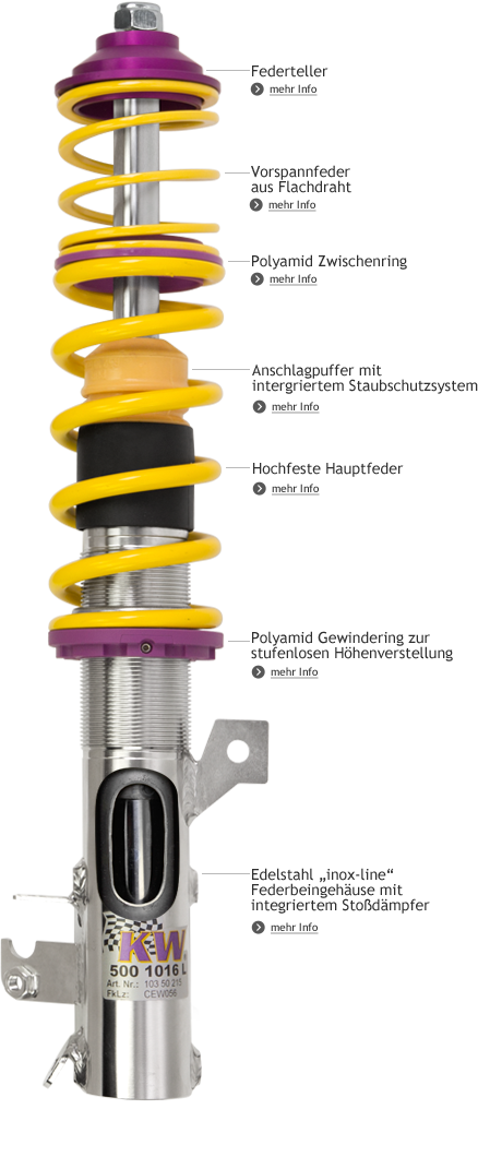 Im Gegensatz zu eloxierten Verstellfedertellern aus Aluminium wird bei KW ein Gewindering aus einem widerstandsfähigen Polyamidverbundwerkstoff mit Edelstahleinlage verwendet. Dadurch wird selbst durch die Einwirkung von Schmutzpartikeln wie Bremsstaub oder Sandkörner der Polyamid-Gewindering nicht beschädigt. Bei eloxierten Aluminium-Federtellern kann es vorkommen, dass nach mehrmaligem Verstellen der Tieferlegung durch die etwaige Reibung von Schmutz auf der Eloxaloberfläche kaum sichtbare Mikrorisse entstehen. An diesen Rissen liegt der ungeschützte Alu-Gewindering direkt auf dem Stahl- bzw. Edelstahl-Federbeingewinde an und es kommt zur Oxidation. Im schlimmsten Falle kann bei herkömmlichen Gewinderingen die Fahrzeughöhe nicht mehr variiert werden. Bei den langlebigen KW Gewindefahrwerken in inox-line und dem verwendeten Polyamid-Gewindering ist dies nicht der Fall.