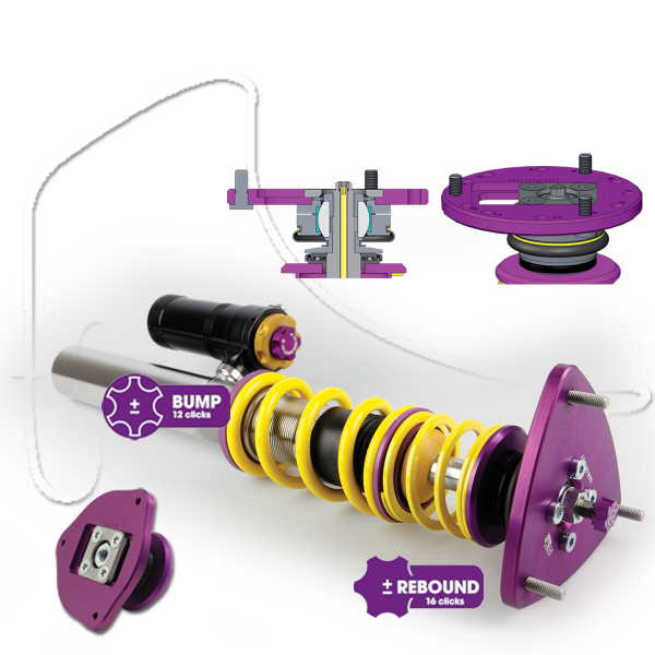 2- oder 3-fach verstellbare Gewindefahrwerke für Rennstrecke und Strasse. Wartungsfreie Komponenten. Für individuelle Setups passend zu Fahrzeuggewicht, Reifen­charakteristik und Streckenbeschaffenheit.