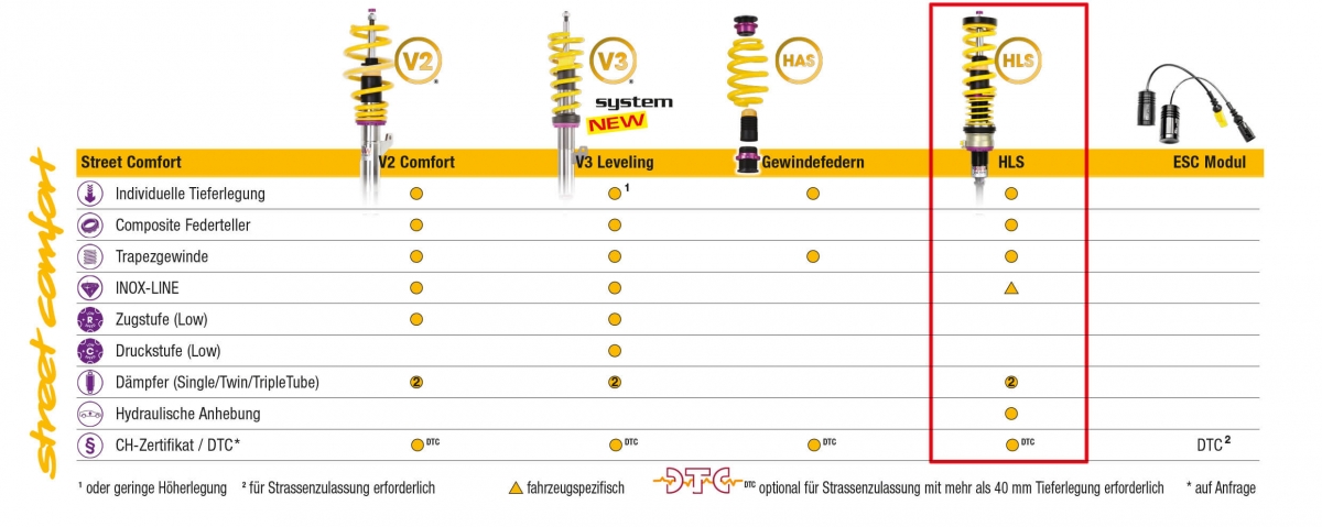 Die Karosserie tiefer gelegter Fahrzeuge und Fahrzeuge mit wenig Bodenfreiheit werden innert Sekunden um bis zu 45 mm hydraulisch angehoben, um Hindernisse problemlos zu überfahren – ideal für Parkhäuser, Garageneinfahrten, Speedblocker oder Absätze in der Fahrbahn. Vorteil des Hydrauliksystems: Keine Komprimierung (Bewegung) der ausgefahrenen Zylindereinheit im Fahrbetrieb und somit keine unerwünschte zusätzliche Federung. Die Hydraulikzylindereinheit wird am Gewindefahrwerk zwischen Federteller und Feder montiert. Aktivierbar im Fahrbetrieb (bis 80 km/h) per Taster vom Innenraum mit LED Positionsanzeige – optional über Funkfernbedienung. Anhebung in 4-5 Sekunden (HLS 2). Als komplette Fahrwerkslösung mit KW Gewindefahrwerk oder als Nachrüstsatz für serienmässige sowie KW Gewindefahrwerke.