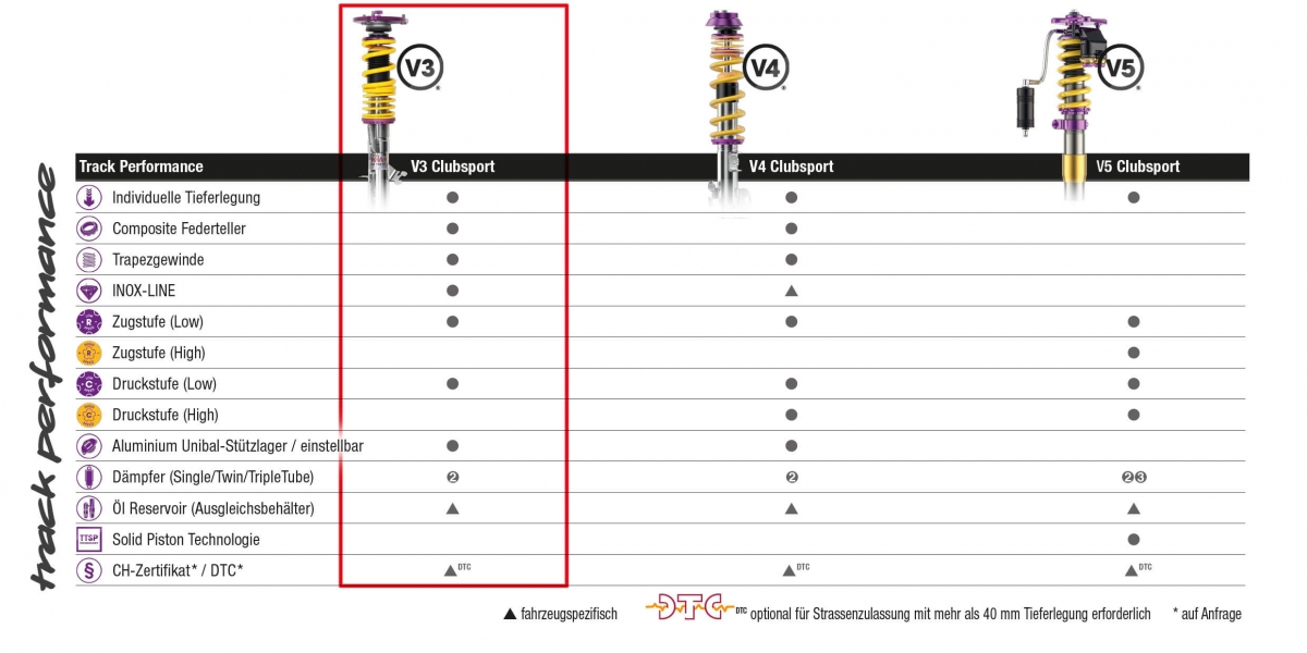 Das perfekt auf die Nordschleife abgestimmte Grundsetup des KW V3 Clubsport Gewindefahrwerks erlaubt durch die vielzähligen Einstellmöglichkeiten Ihren Sportwagen auf das gewünschte Strassensportreifen-Setup individuell abzustimmen. Die separat in Zug- und Druckstufe einstellbaren Dämpfer mit ihrer «TVR-A»- und «TVC-A»-Technologie erlauben eine umfangreiche Dämpferabstimmung vorzunehmen. So ist es ein Leichtes, das Einlenkverhalten, die Spurtreue, den Reifengrip und Handling-Eigenschaften massgeblich für eine sichere Kontrollierbarkeit im Grenzbereich direkt zu beeinflussen.
