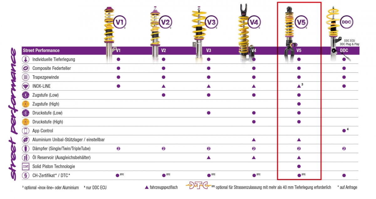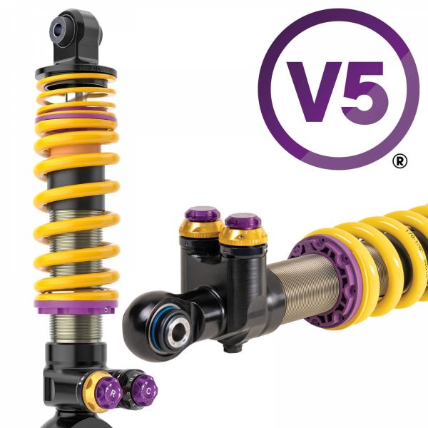 Adaption der erfolgreich im GT3 Motorsport verwendeten KW Fahrwerktechnologie mit Verdrängerkolben und in Serie geschalteten Dämpferventilen. 4-fach leistungseinstellbar. Seitlich platzierte Ventile für Low- und Highspeedkräfte der Druckstufen- sowie Zugstufendämpfung. Fahrzeugspezifisch Dämpfer und Federbeine in Aluminium oder Edelstahl, Aluminium-Uniballager, progressive Federn oder 2-teiliges Rennsportfedersystem.